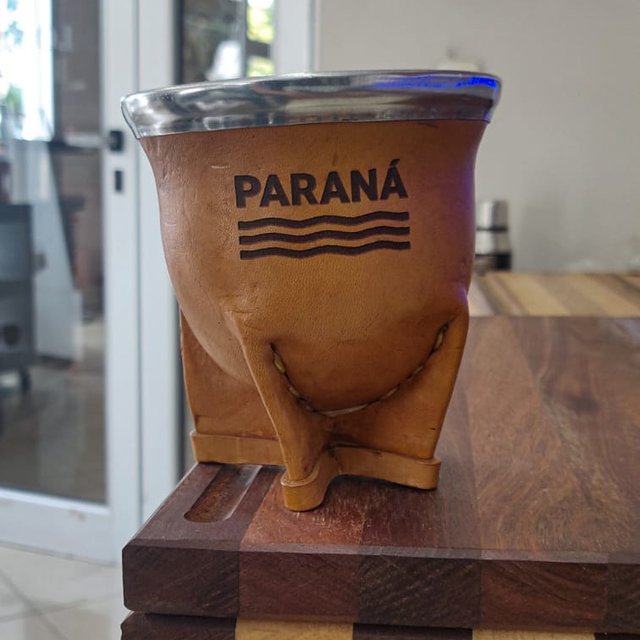 Mate camionero de calabaza recubierto en cuero con virola y grabado sobre cuero PARANÁ